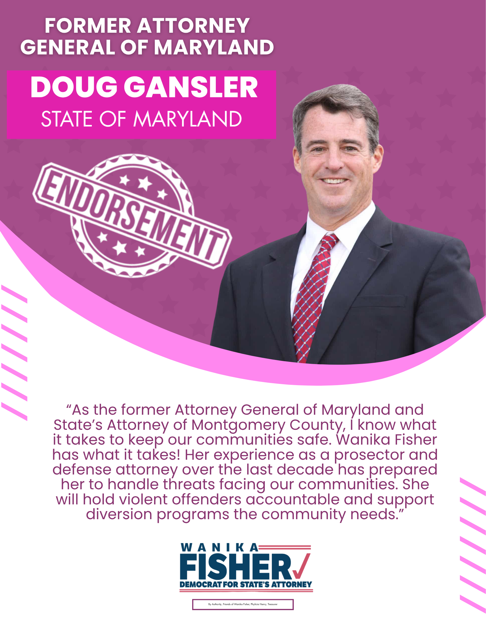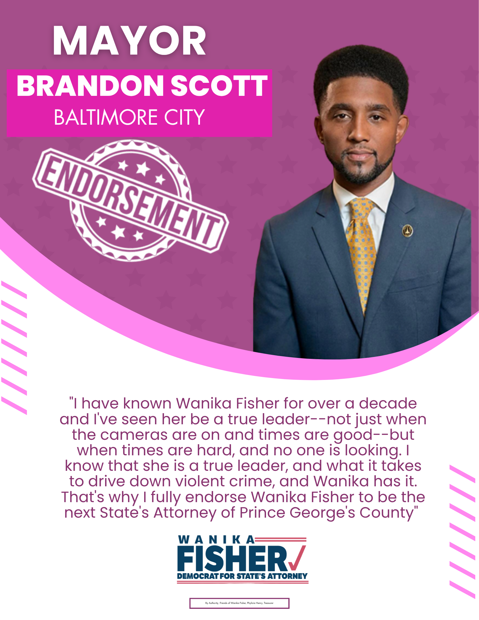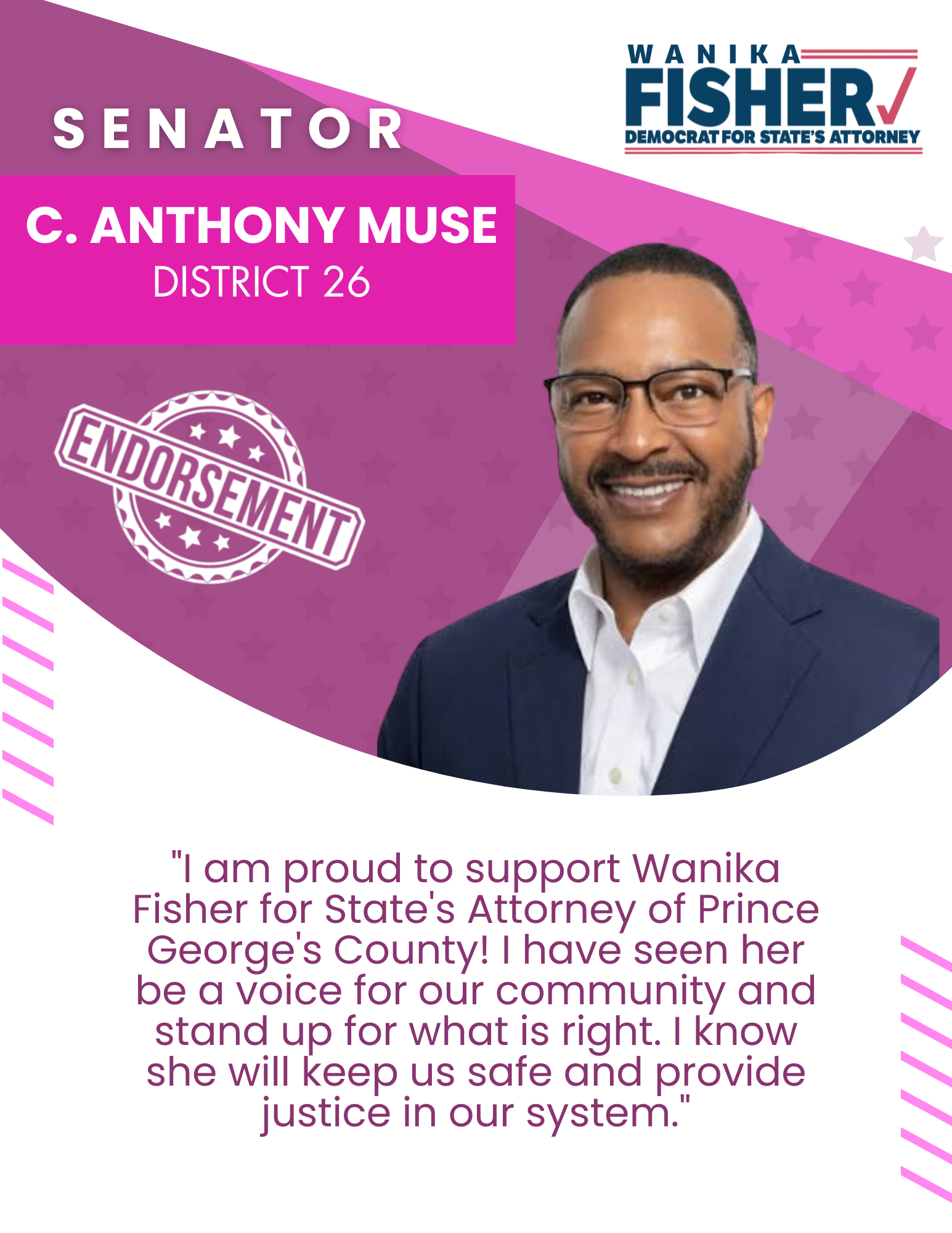 As a proud member of Alpha Kappa Alpha Sorority, Inc., Wanika understands the importance of community engagement and advocacy. Now, she is ready to bring her experience and passion for justice to the office of State’s Attorney, ensuring that every voice in Prince George's County is heard and respected. Together, we can build a safer, more equitable community for all. Vote Wanika B. Fisher for State’s Attorney!
