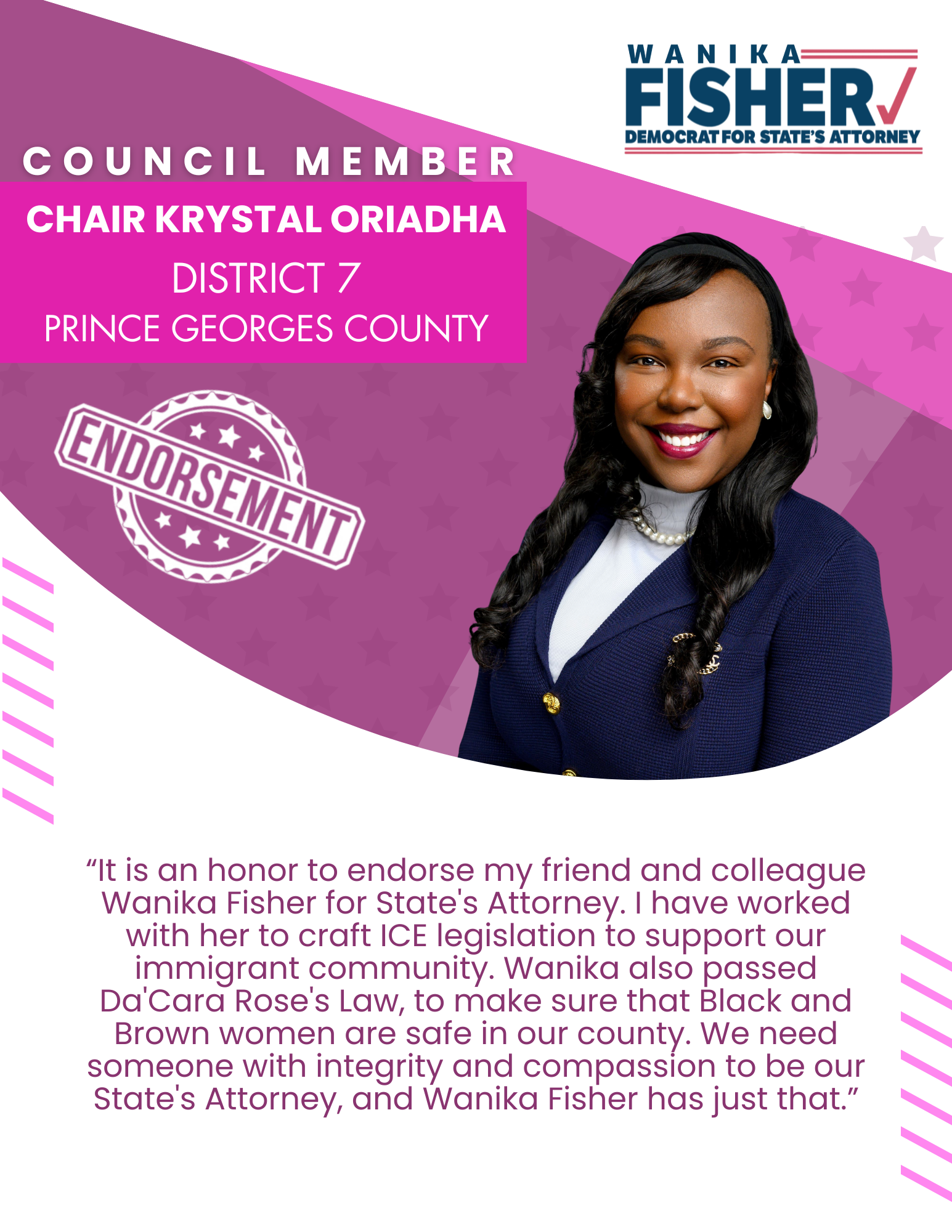 Advocate for Immigrant Rights: Wanika is committed to ensuring that immigrant communities feel safe and supported in Prince George's County, advocating for justice and protection for all residents.